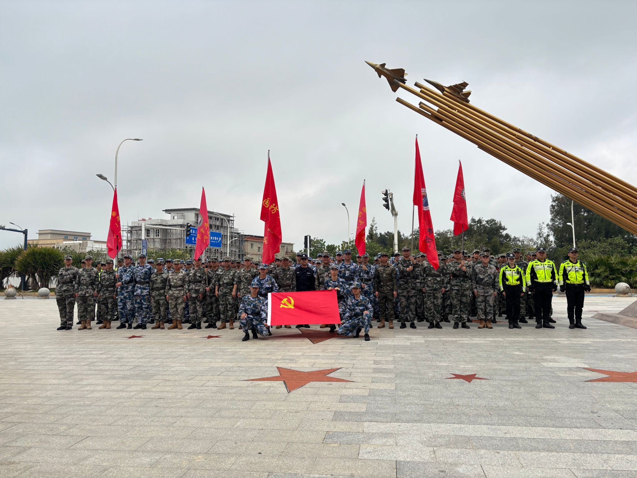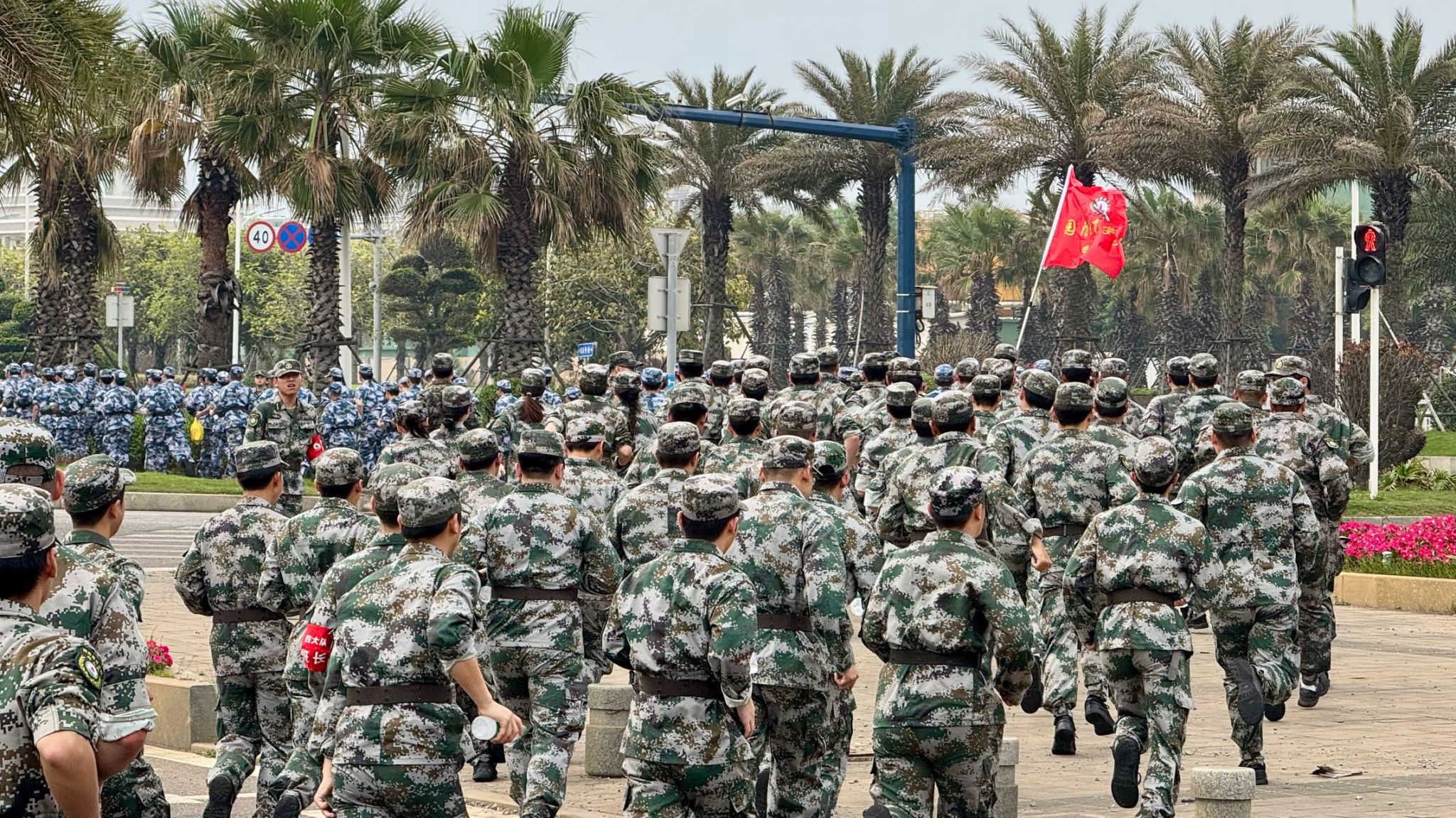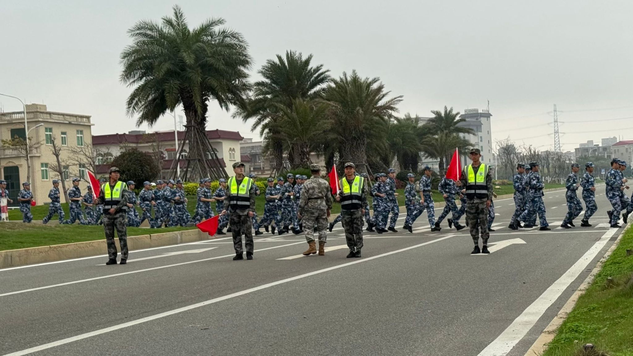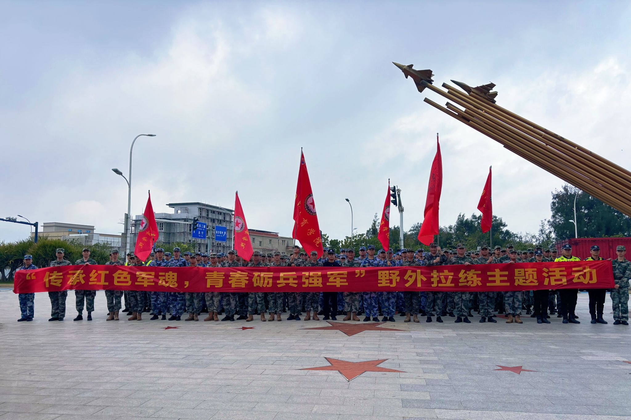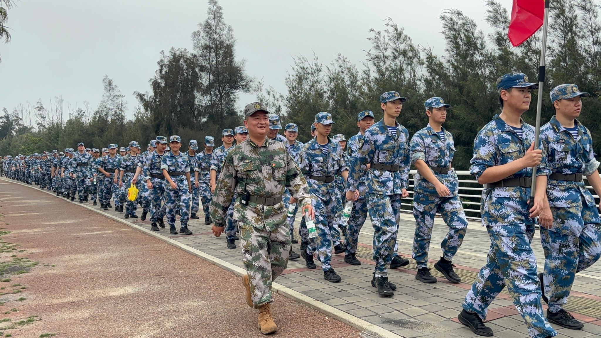 队伍成两路纵队沿预定路线行进,红旗在队首迎风招展。“一二三四”的呼号声此起彼伏,各大队轮流领唱《强军战歌》《团结就是力量》等军旅歌曲,节奏稳定、气氛热烈。行军途中,个别学员出现低血糖、中暑等身体不适,随队医疗保障人员迅速处置,经短暂休整后均顺利归队。全程无一人掉队,行进秩序始终严整。