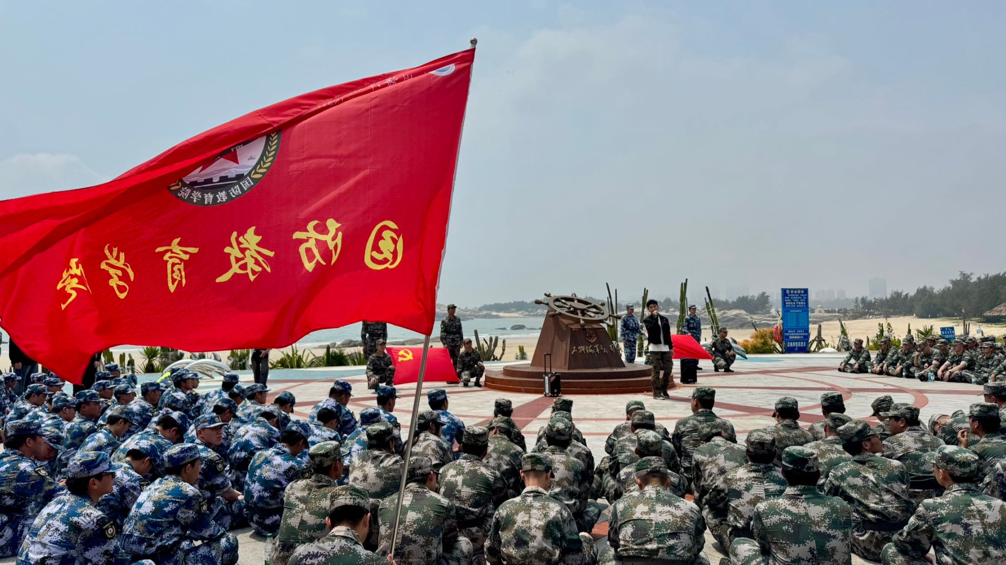歌舞表演结束后,全体人员肃立,奏唱中华人民共和国国歌。雄壮的旋律在海天之间响起,每一个人神情庄重,歌声整齐有力。奏唱完毕,全体学员面向团旗整队肃立,举行重温入团誓词仪式。领誓人走到队列前方,右手握拳举起,全体学员随之高举右拳,字句铿锵,每一张年轻的面孔上都写满庄重。