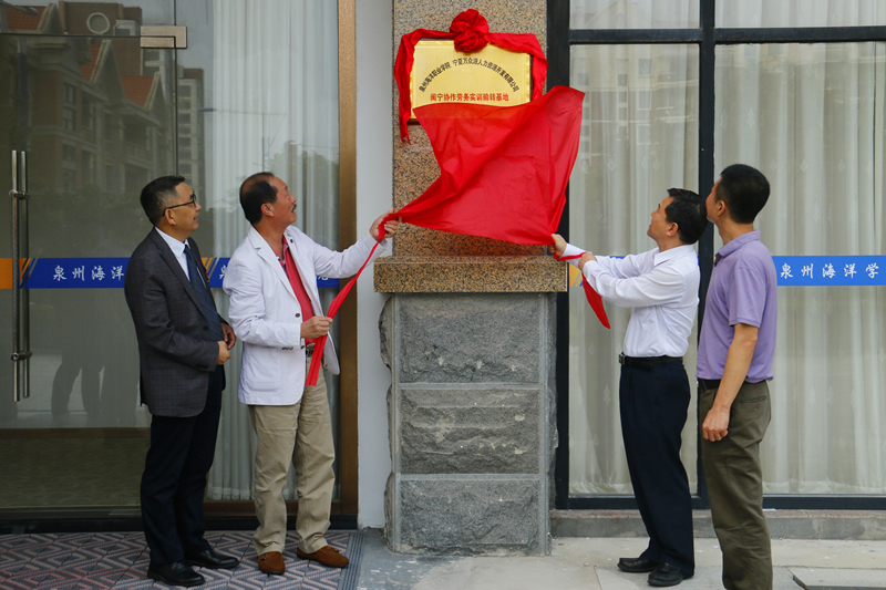 (黄水木市长、蔡天真董事长、柏定国校长和王金钟先生共同为闽宁劳务实训基地揭牌)