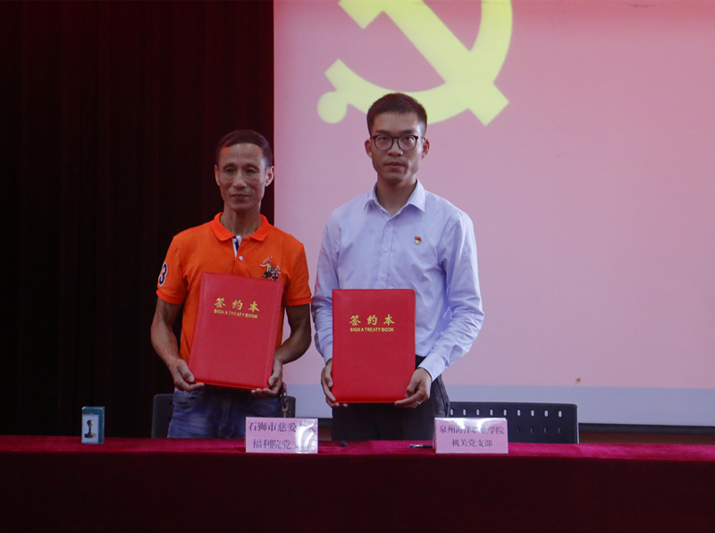 大会还举行了机关党总支与石狮市慈爱老人福利院党支部的共建签约仪式。机关党总支书记周甜老师与石狮市慈爱老人福利院院长、党支部书记林邦奖代表双方上台签约。