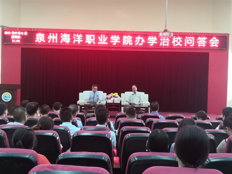 新闻中心讯(党政办报道)7月18日下午,泉州海洋职业学院办学治校问答会在2204报告厅如期举行。蔡天真董事长、柏定国校长及全体校领导、各单位负责人、各专业负责人参加会议。本次问答会旨在鼓励大家畅所欲言、献言献策,一方面是为各单位答疑解惑,另一方面是听取大家的意见和建议,共谋学校发展大业。