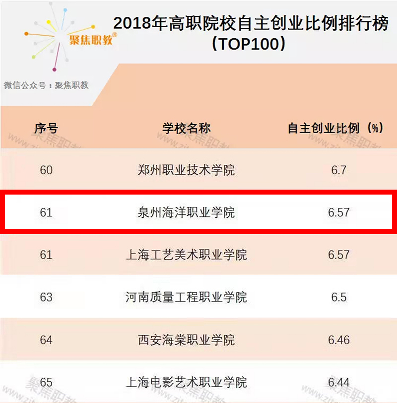 新闻中心讯(党政办报道)近日,《2019年全国高职院校自主创业比例排行榜》正式出炉,本次排行榜通过统计全国范围内1326所高职院校高等职业教育年度报告的基础上,对各高职院校大学生自主创业比例进行排列,最终确定全国高职院校自主创业百强校。在本次排名中,泉州海洋职业学院以6.57%的自主创业比例成功入选全国百强校,位列全国第61位,在全省高职院校中排名第六。