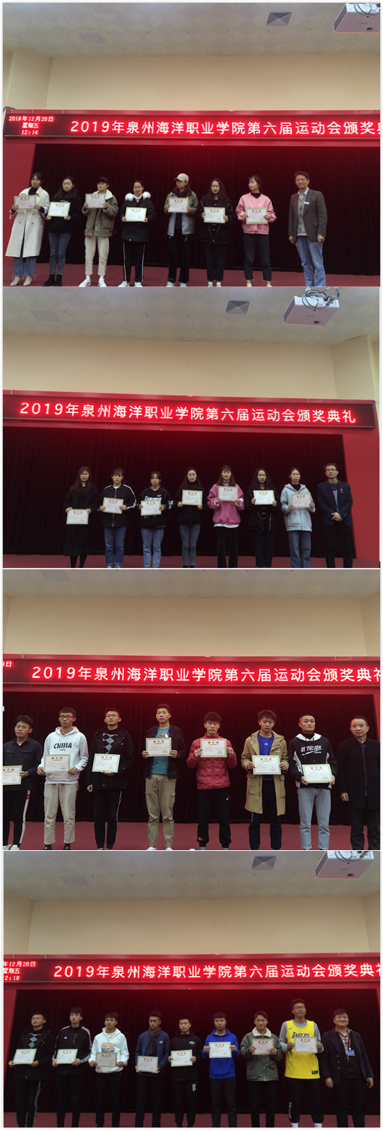 新闻中心讯(休闲文旅学院 张永方供稿 党政办编辑)泉州海洋职业学院第六届田径运动会已经落下帷幕,为了表彰运动健儿在运动会中的卓越表现和突出贡献,泉州海洋职业学院体育运动委员会于12月20日在2204大礼堂举行了隆重的颁奖仪式。出席本次颁奖的领导有吴广华副校长、党委副书记李明灿、教务处钱学东处长、学工部苏良城部长、休闲文旅学院孙玉坤院长、团委书记周甜等,颁奖仪式由休闲文旅学院孙玉坤院长主持。