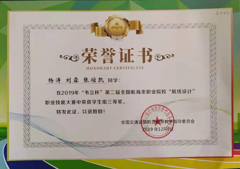 为了提高并展示我校航海技术专业的教学质量和学生的技能水平,航海物流学院精心组织学生积极备战本次比赛。比赛中,同学们沉着冷静。由航海171班杨涛,183班刘露、张烜凯,指导教师杨新彪、邓东辉组成的参赛代表队最终获得三等奖的优异成绩。