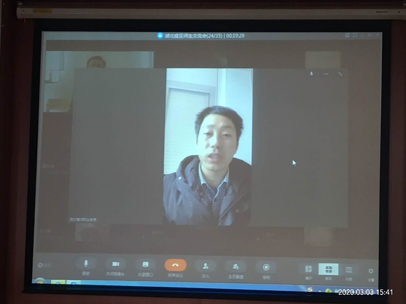 2020年3月3日下午3点半,我校柏定国校长、梁松刚书记、李明灿副书记、张超副校长及苏良城、官磊、黄玲玲等处室领导通过网络视频连线,与我校身在湖北的师生亲切交流,了解大家所在地区的疫情形势、在家的学习生活状况、家人的健康与工作等,校领导纷纷与大家寄语共勉,给大家打气加油,“家人似的关心”平实而温暖,让所有湖北师生感受到来自学校的关心,从而更加坚定了平稳居家防控疫情的信心和决心。