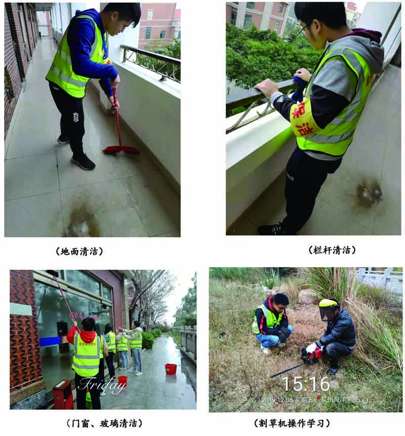 《综合劳动周:劳作意识与技能》课程,由学校与福建南丁格尔物业管理公司共同组织实施,采取理论+实践的授课方式,开展保洁工具认知与使用、绿化养护、校园巡逻与治安维护等课程,劳动课程的开展提高了学生劳作、环保、服务意识、提升了学生劳作技能技巧、增强学生安全防范意识、培养了学生团结友爱共同协作的团队精神,能够很好地引导学生对劳动的正确态度和看法,养成热爱劳动的习惯。