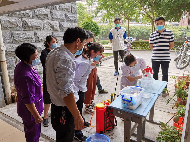 培训会上林凉凉医师从病毒消杀方式、消毒药物配比、重点场所消杀、消杀防护要点、口罩佩戴要求、手部清洁规范等方面进行了讲解培训和演示。会后倪书记一行走访图书馆和食堂,对学校相关人员密集场所的疫情防控工作进行指导。