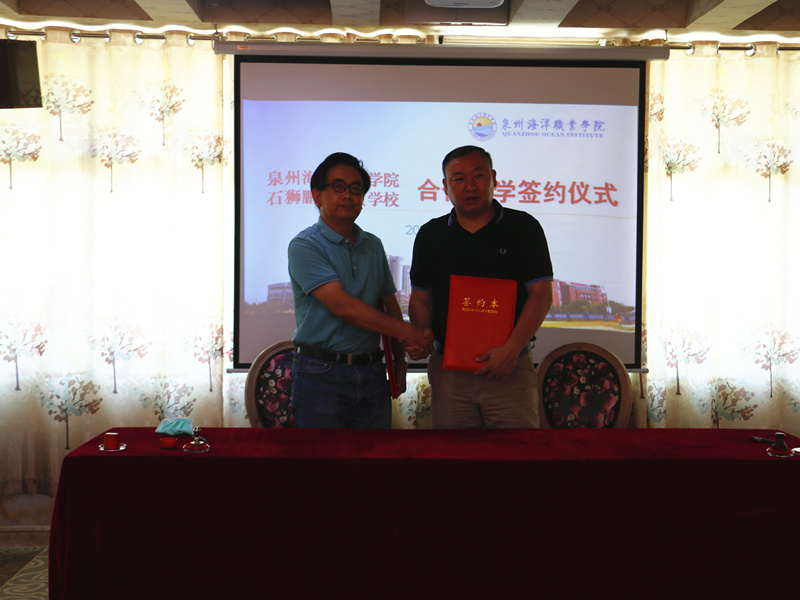 新闻中心讯(党政办报道)为进一步落实《国家职业教育改革实施方案》等职业教育要求。6月19日,我校与石狮鹏山工贸学校签订中高职联合办学协议。我校董事长蔡天真、校长柏定国、副校长张超,鹏山工贸学校常务副校长杜振乐及两校相关部门负责人参加签约仪式。