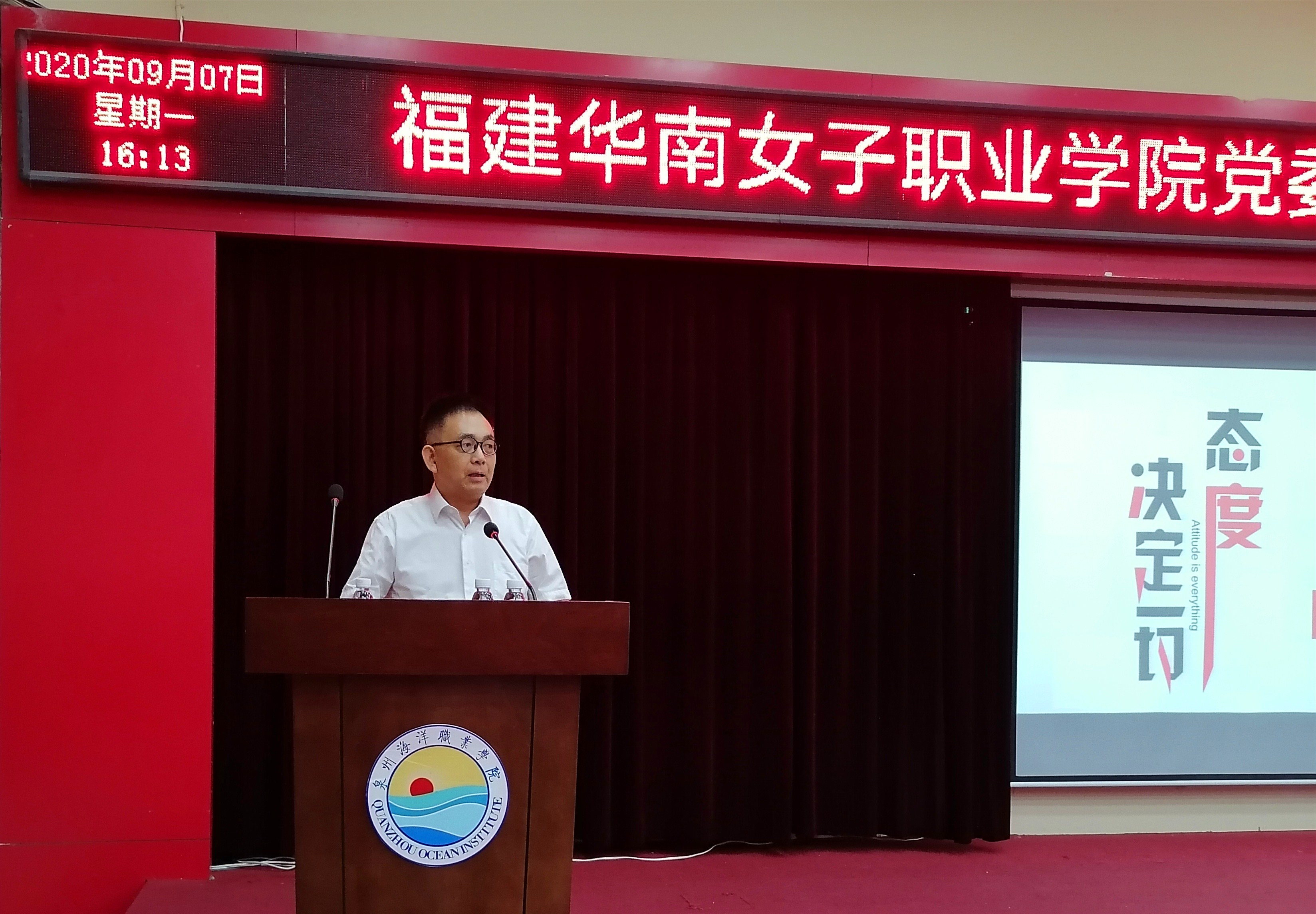新闻中心讯(党政办报道)为进一步提高认识,学习经验,发挥民办高校党委在办学治校中的引领作用,9月7日,福建华南女子职业学院党委书记王海燕应邀来校为我校全体教职工举办一场专题讲座。校领导班子与全体教职工共同聆听讲座。