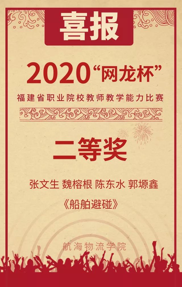 新闻中心讯(李静供稿 党政办报道)近日,2020年“网龙杯”福建省职业院校教师教学能力比赛获奖名单公布。由张文生、魏榕根、陈东水、郭塬鑫组成的航海技术教学团队,其参赛作品《船舶避碰》荣获二等奖。