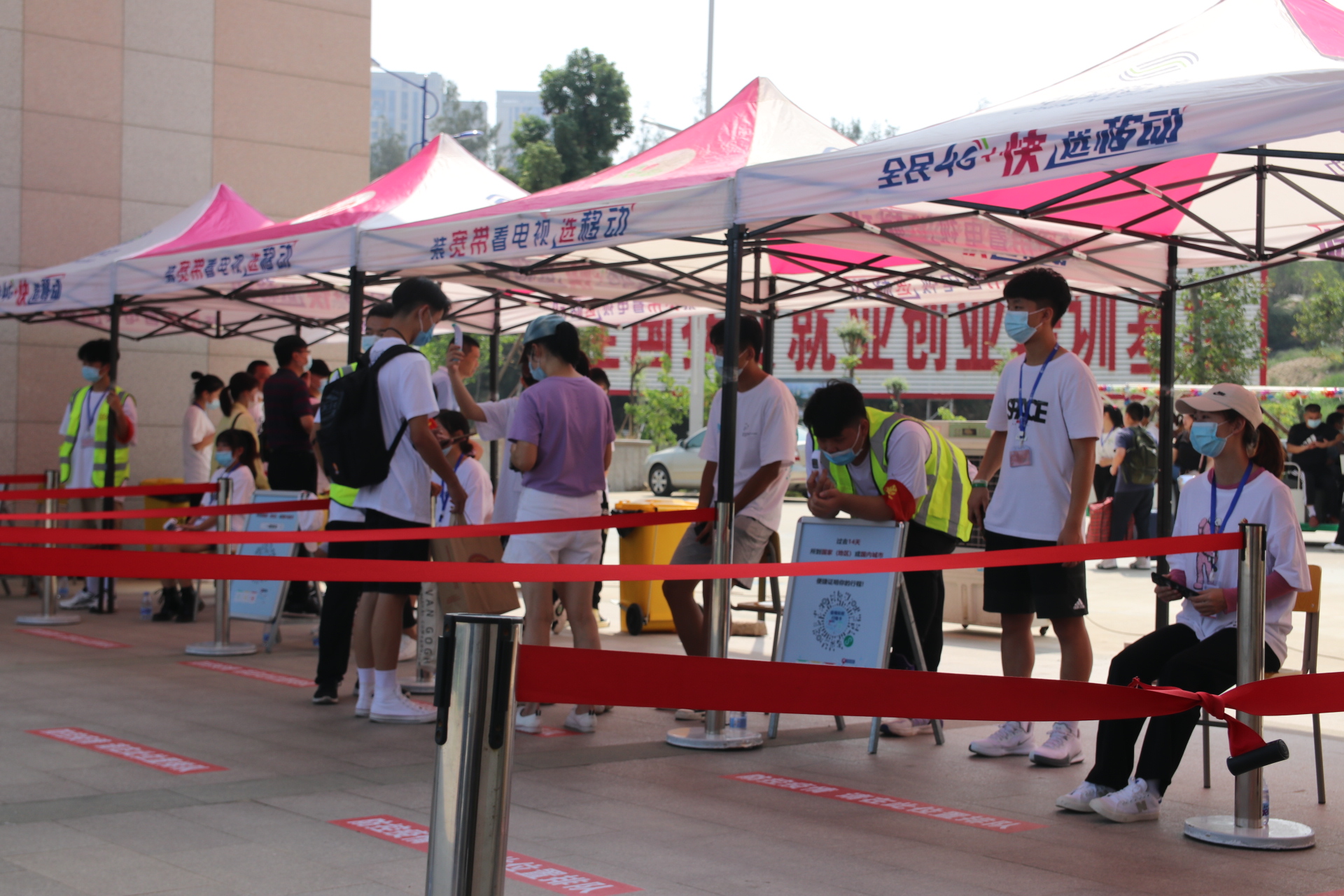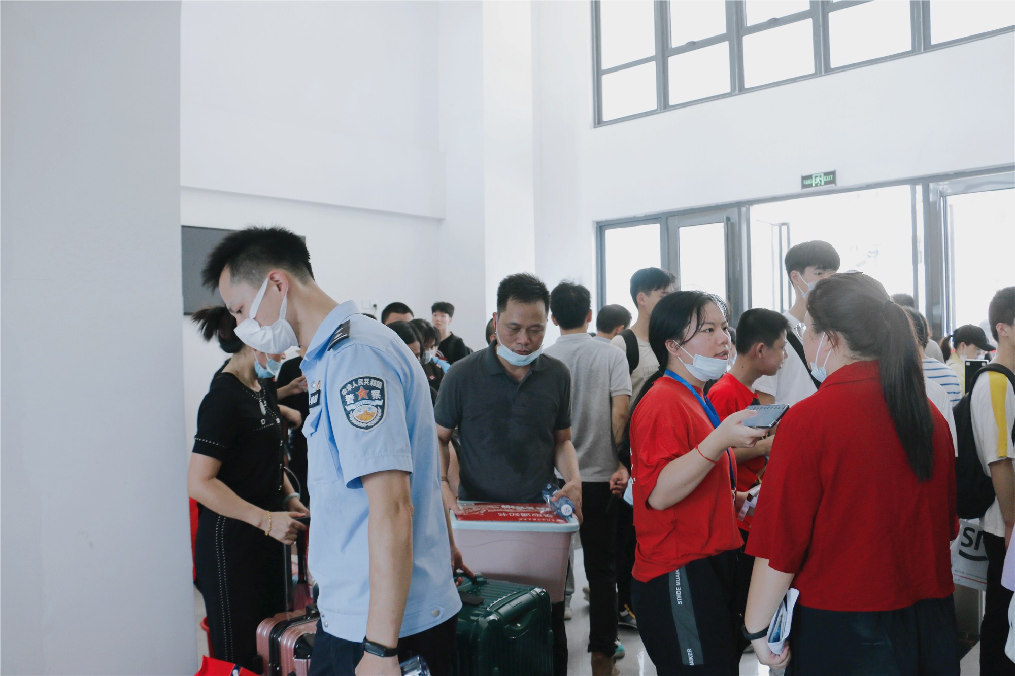 由于本次疫情防控需要,新生接待当天需登记健康码和监测体温。考虑到天气炎热,新生搬运行李困难。学校安排各学院学生组成“服务志愿者接待队”帮助新生搬运行李物品。志愿者们尽心尽力,守在服务点,高度专注于跟进新生及家长的需求,指引新生到前台报到,帮助新生完成领取物资流程并将大件行李物品从物资处一路搬运至宿舍,叮嘱新生准备好开学及军训所需物品。