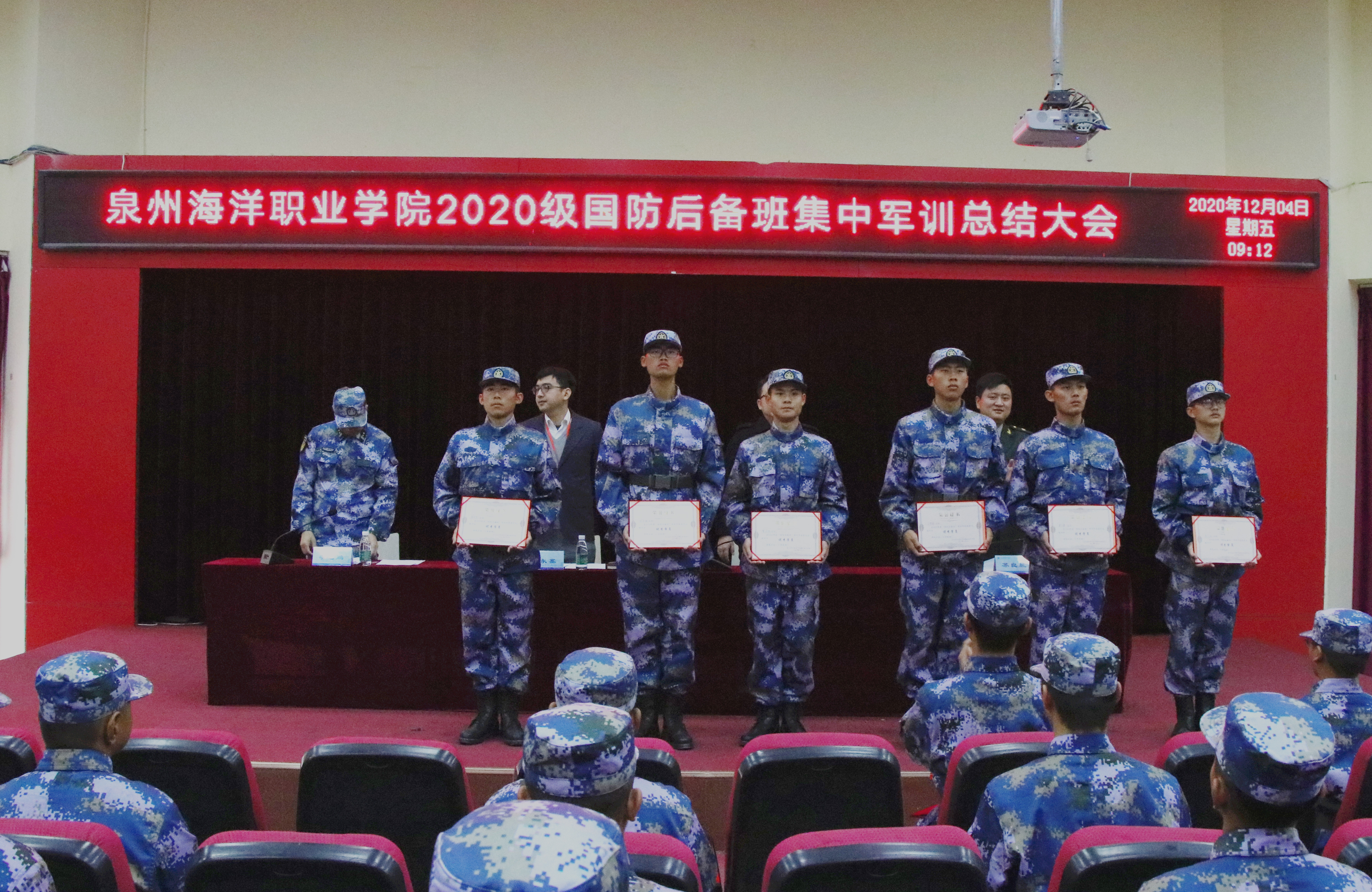 新闻中心讯(李艺鹏供稿 党委宣布部供稿)2020年12月4日,我校2020级国防后备班集中军训总结大会在2204报告厅举行,副校长张超、副校长陈永鑫、校长助理兼武装部长苏良城及国防教育基地书记李艺鹏等领导出席。国防学院的全体同学及教官、老师参加了会议。本次会议由李艺鹏书记主持。会议在雄壮的《中国人民解放军军歌》中拉开帷幕。