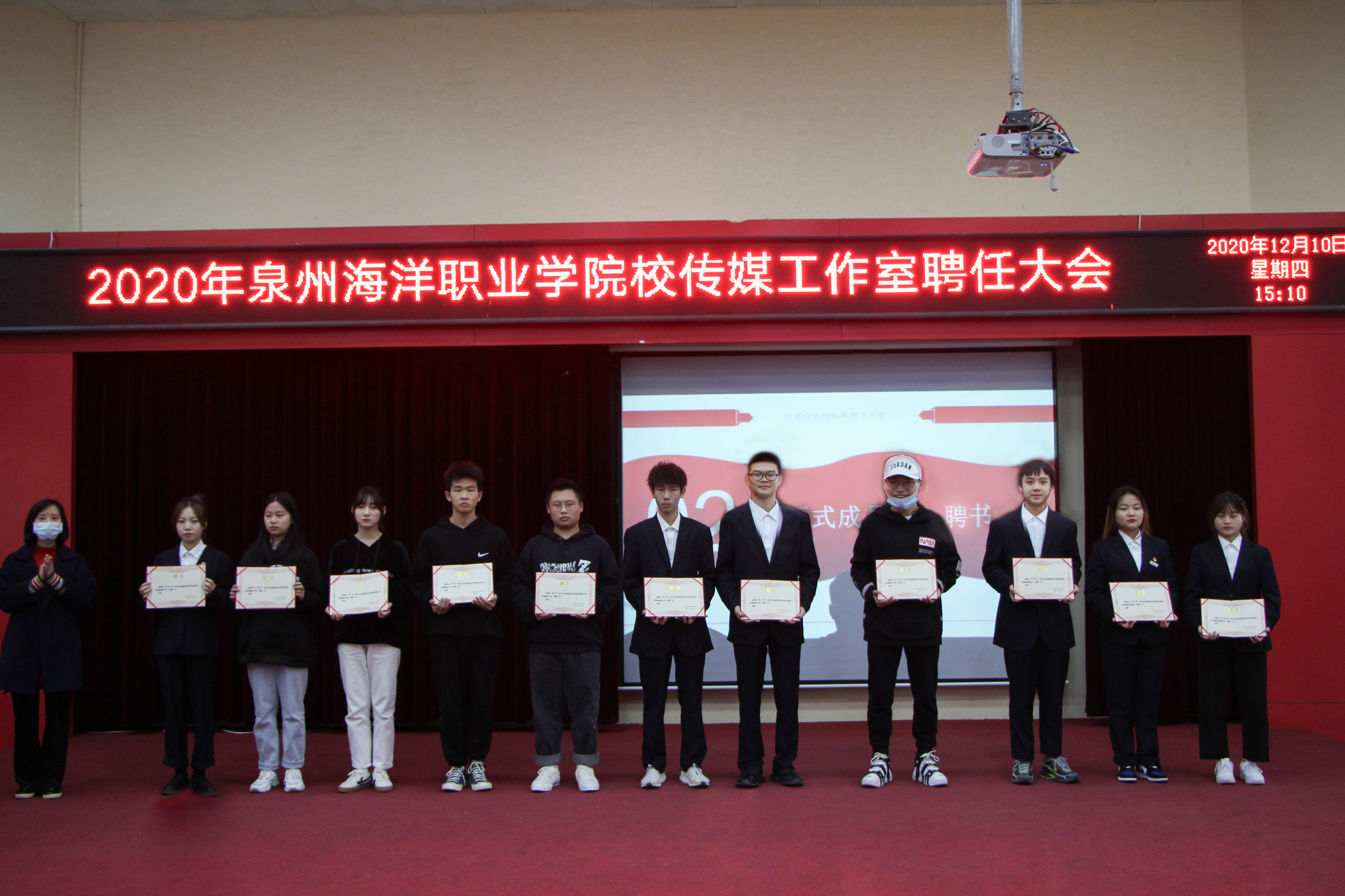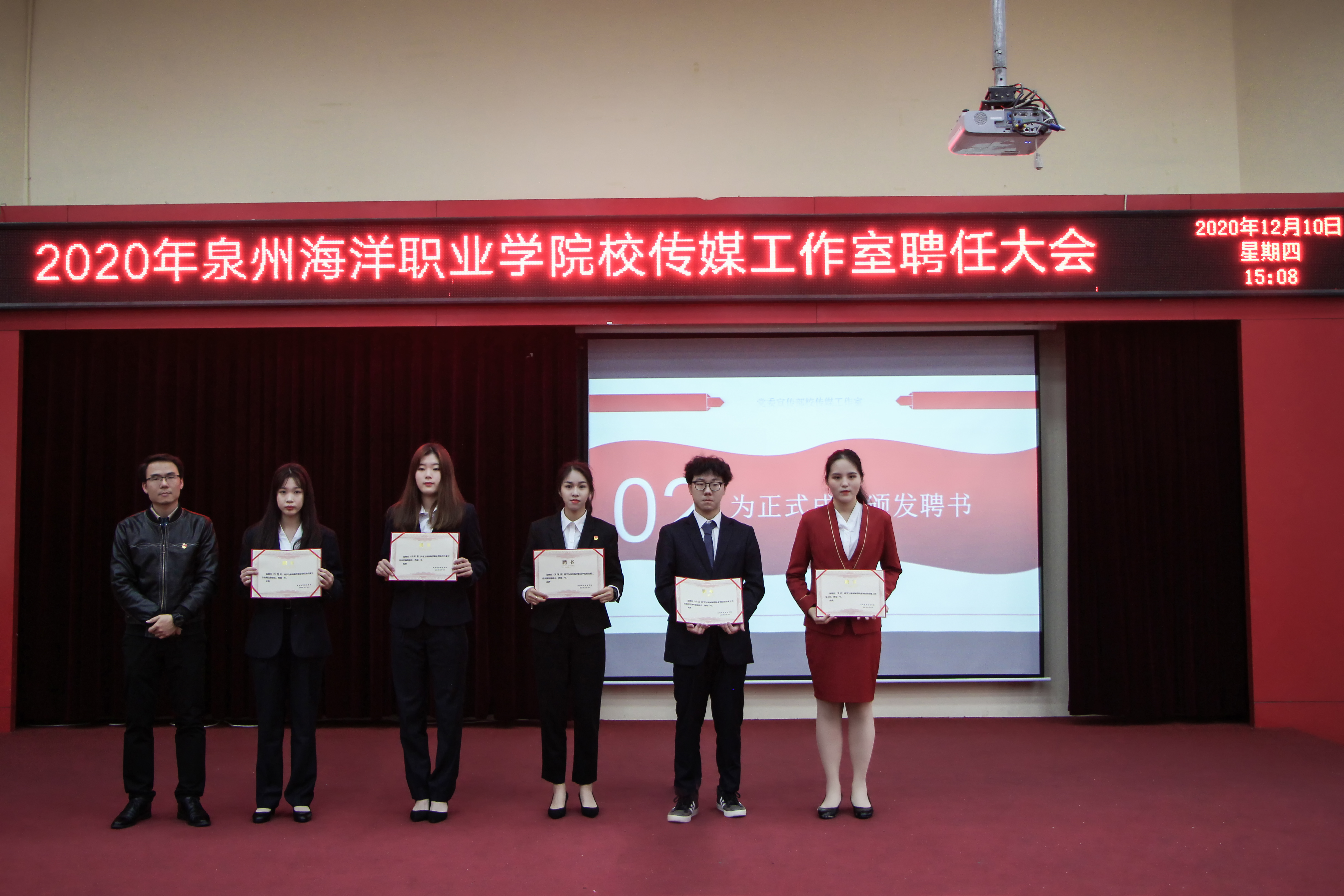 新闻中心讯(校传媒 高执供稿 党委宣传部报道)12月10日下午15:00,泉州海洋职业学院校传媒工作室聘任大会于2204报告厅顺利举行。党委副书记李明灿、党政办公室主任黄玲玲、社团指导老师黄小格、党务秘书阮玲玉老师及各二级学院辅导员等应邀出席担任嘉宾,各学生团体组织代表和校传媒工作室全体成员共同参加此次大会。本次大会由来自校团委融媒体中心播音部的郑珊珊同学主持。