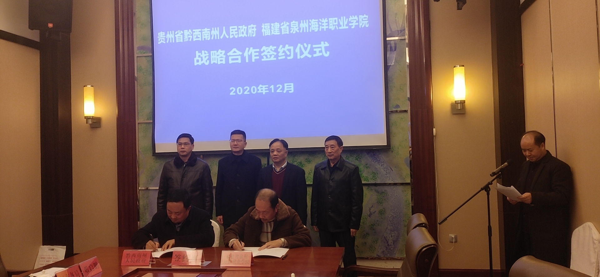 新闻中心讯(党委宣传部报道)12月19日,泉州海洋职业学院与贵州省黔西南州政府战略合作签约仪式在黔西南州举行。黔西南州州委常委兼州政府副州长田宾、中国扶贫志愿服务促进会副会长李振生、州政府副州长兼州扶贫办主任刘兴吉、州政协副主席兼安县委书记农文海及我校董事长蔡天真等出席本场仪式。