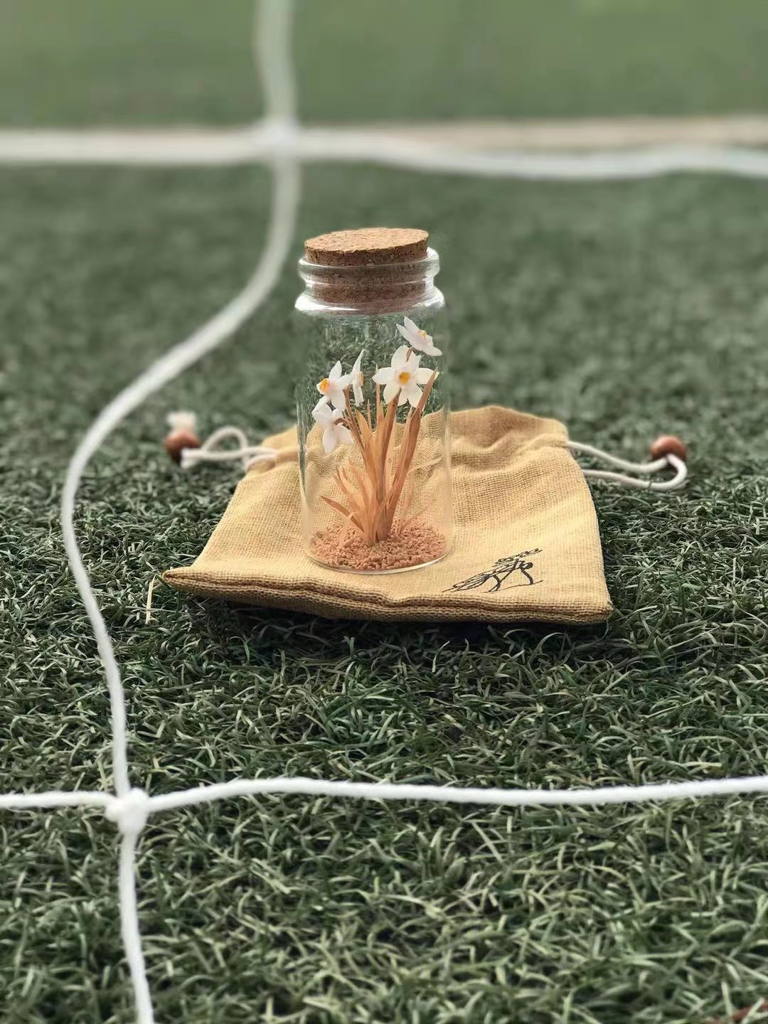 软木画是具有代表性的福建特色文化。作品《福建花-软木画瓶》保持了软木画原有框景的手法,区别于传统软木画大而笨重的特点,将通草与软木结合起来,用通草作为花蕊,软木作花茎,放入了漂流瓶中,形成小而巧的软木画制品。