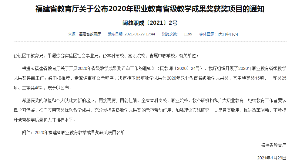 新闻中心讯(教务处 邱妮娜供稿 党委宣传部报道)1月29日,福建省教育厅下发《福建省教育厅关于公布2020年职业教育省级教学成果奖获奖项目的通知》,我校申报的《基于“一体四翼”扶贫高职教育“二元制”人才培养模式创新与实践》(成果完成人:钱学东、柏定国、官磊、郑玉花、王志华、蔡泽群、蔡永鸿、林杰民)项目荣获2020年职业教育省级教学成果二等奖。