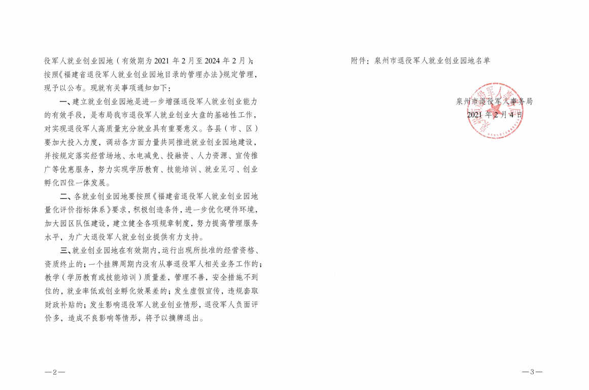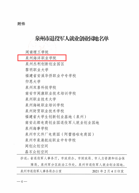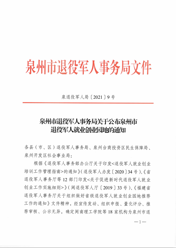 新闻中心讯(党委宣传部报道)根据《退役军人事务部办公厅关于印发〈退役军人就业创业 培训工作管理指南〉的通知》(退役军人办发〔2020〕34号)、《省 退役军人事务厅等12部门印发〈关于促进新时代退役军人就业创业工作实施细则〉》(闽退役军人厅〔2019〕33号)、《福建省退役军人事务厅关于组织做好省级退役军人就业创业园地推荐 工作的通知》文件精神,经宣传发动、组织申报、量化评分、推荐审核、公示无异,确定我校等18家机构为泉州市退役军人就业创业园地(有效期为2021年2月至2024年2月)。