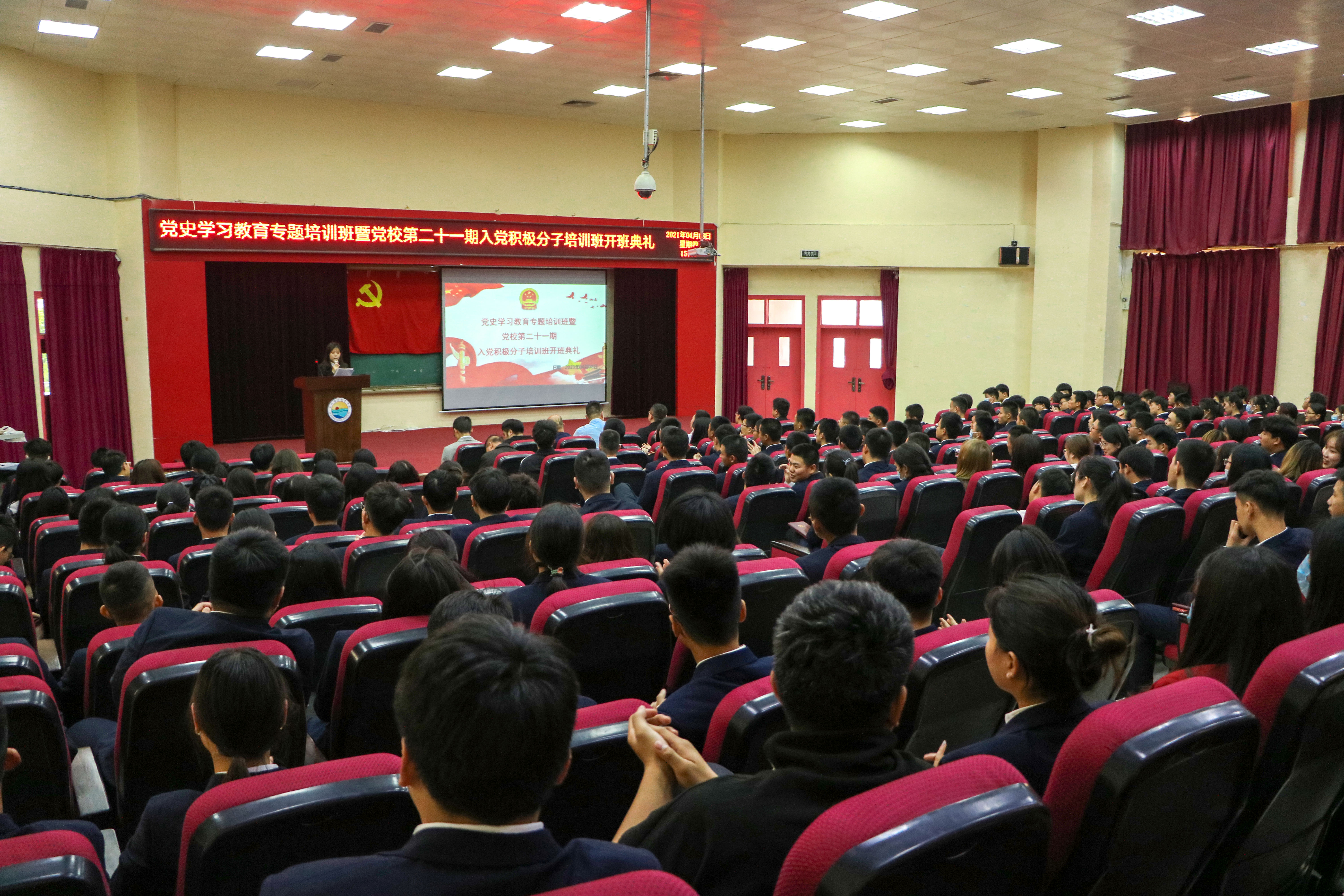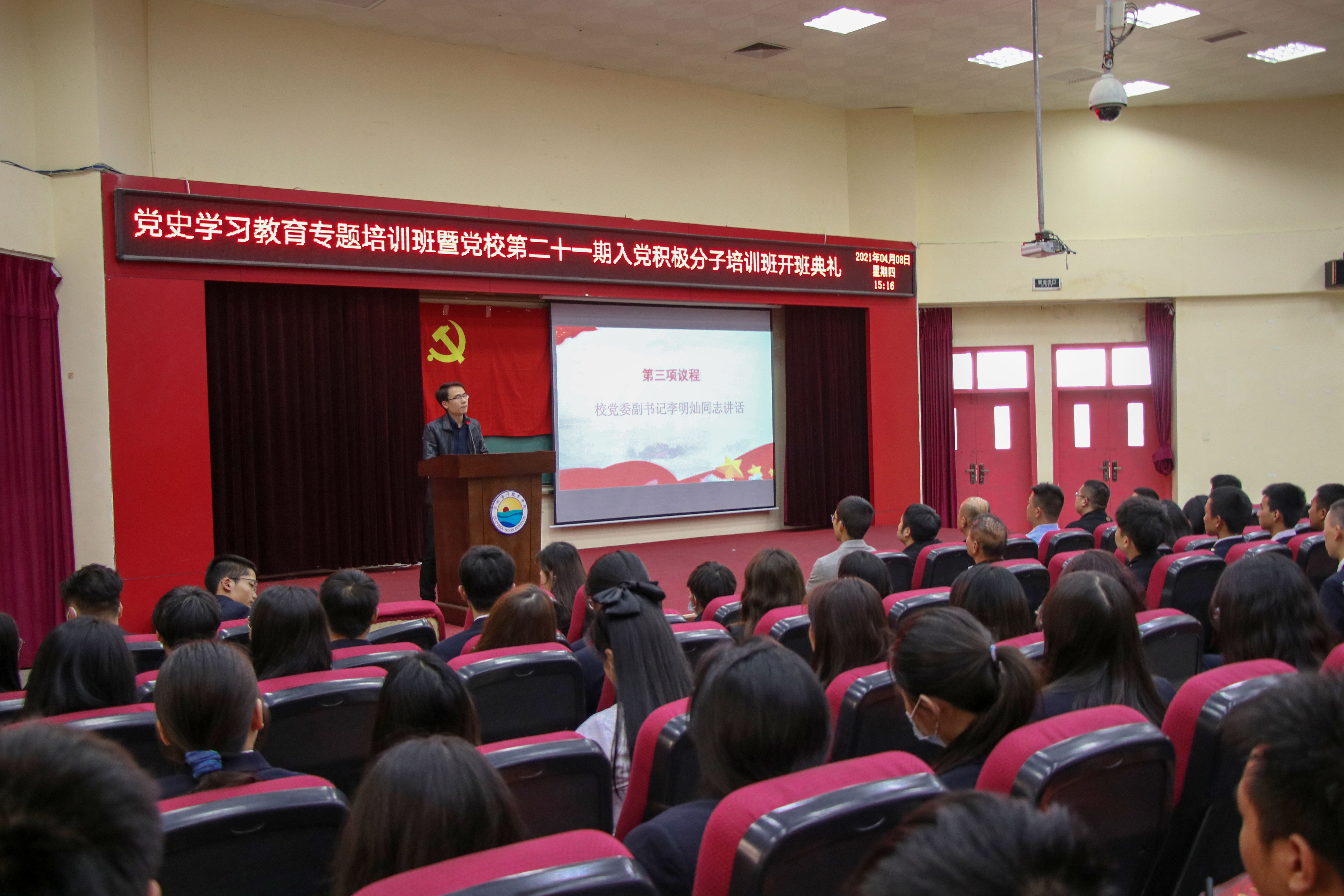 新闻中心讯(党政办阮玲玉供稿 党委宣传部报道)为深入开展党史学习教育活动,进一步加强对入党积极分子的培养、教育和考察,严格把好党员发展“入口关”。2021年4月8日,我校党史学习教育专题培训班暨党校第二十一期入党积极分子培训班开班典礼于2204报告厅举行。校党委书记梁松刚,校党委副书记李明灿、副校长张超等全体党委委员出席会议,各基层党组织书记、支委和第二十一期入党积极分子培训班全体学员参与此次会议。本次开班典礼由党务秘书阮玲玉主持。