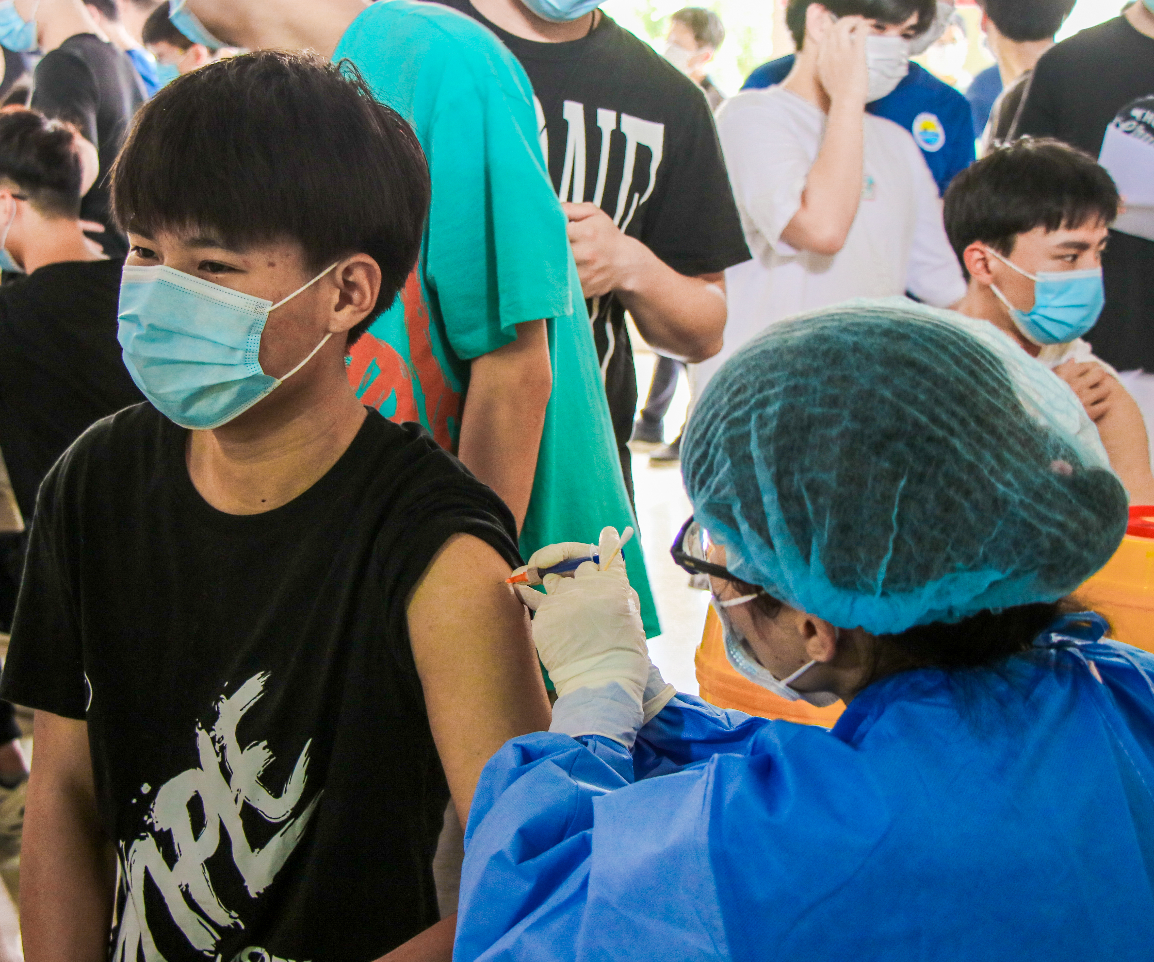 早上八点疫苗接种现场,参与本次接种的师生佩戴好了口罩,依次排队等待入场,志愿者们在楼道引导场内秩序。参与接种的人员们按照现场接种工作要求,完成身份信息登记。接种前,现场医护人员仔细询问师生身体状况,核对个人信息,以保证安全接种。