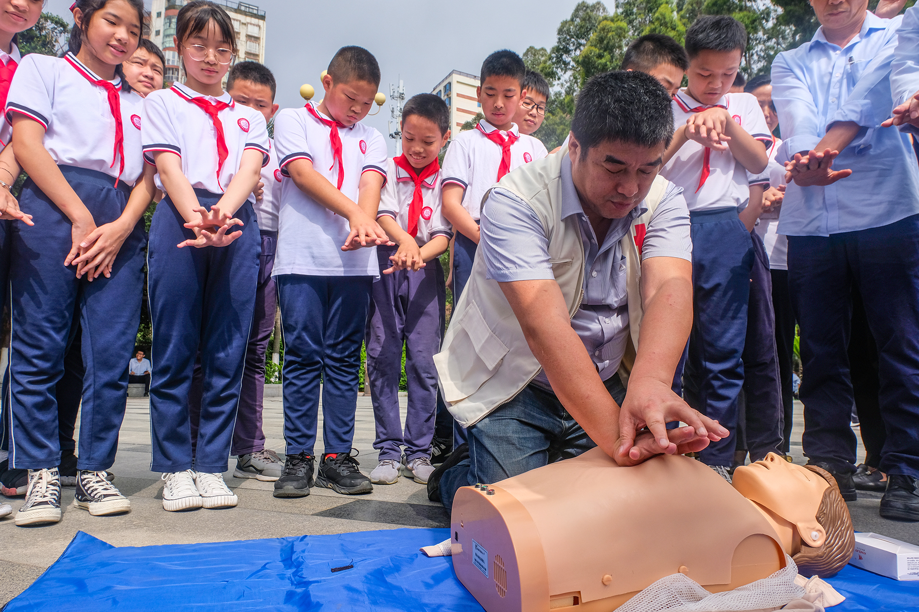 活动中,我校学生积极参与各项应急技能学习并在市红十字会志愿者的指导下进行心肺复苏现场急救模拟演练,通过实践提高自身自救互救能力。