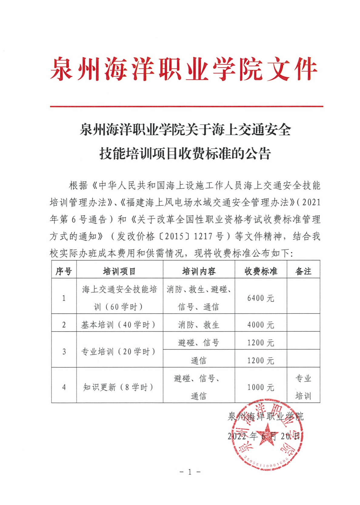 泉州海洋职业学院关于海上交通安全技能培训项目收费标准的公告