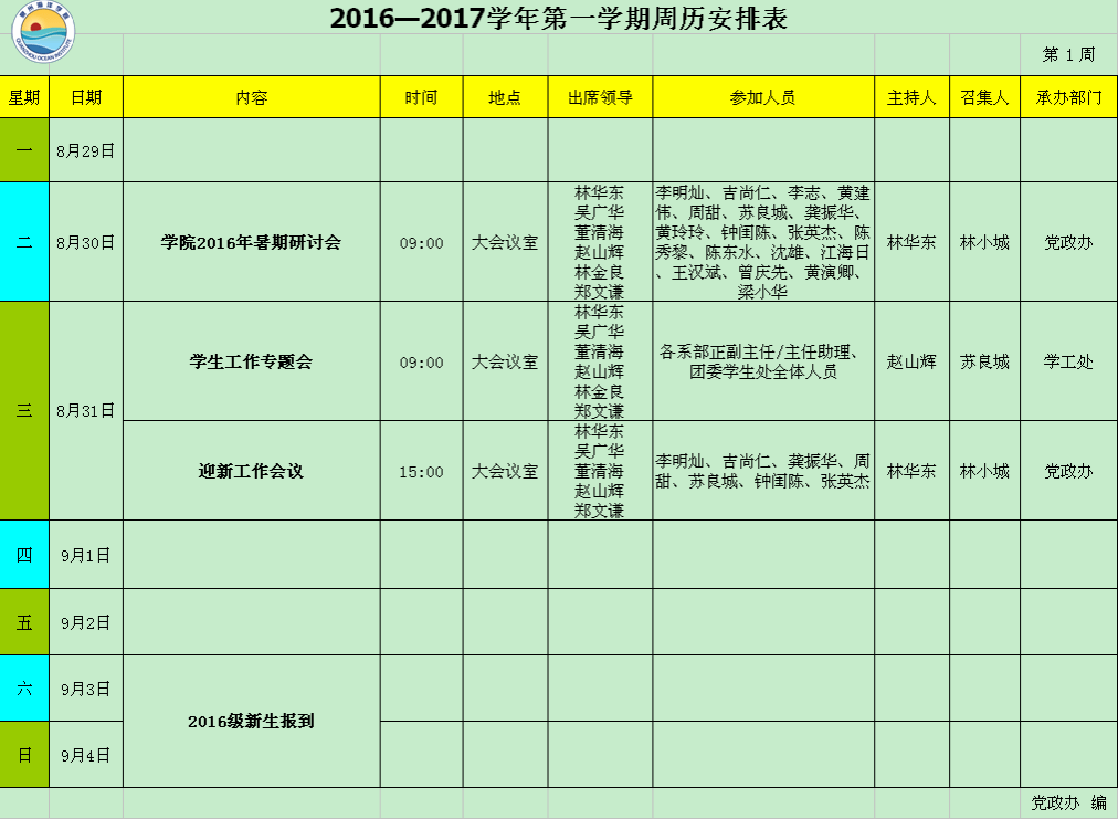 2016—2017学年第一学期第1周周历安排表