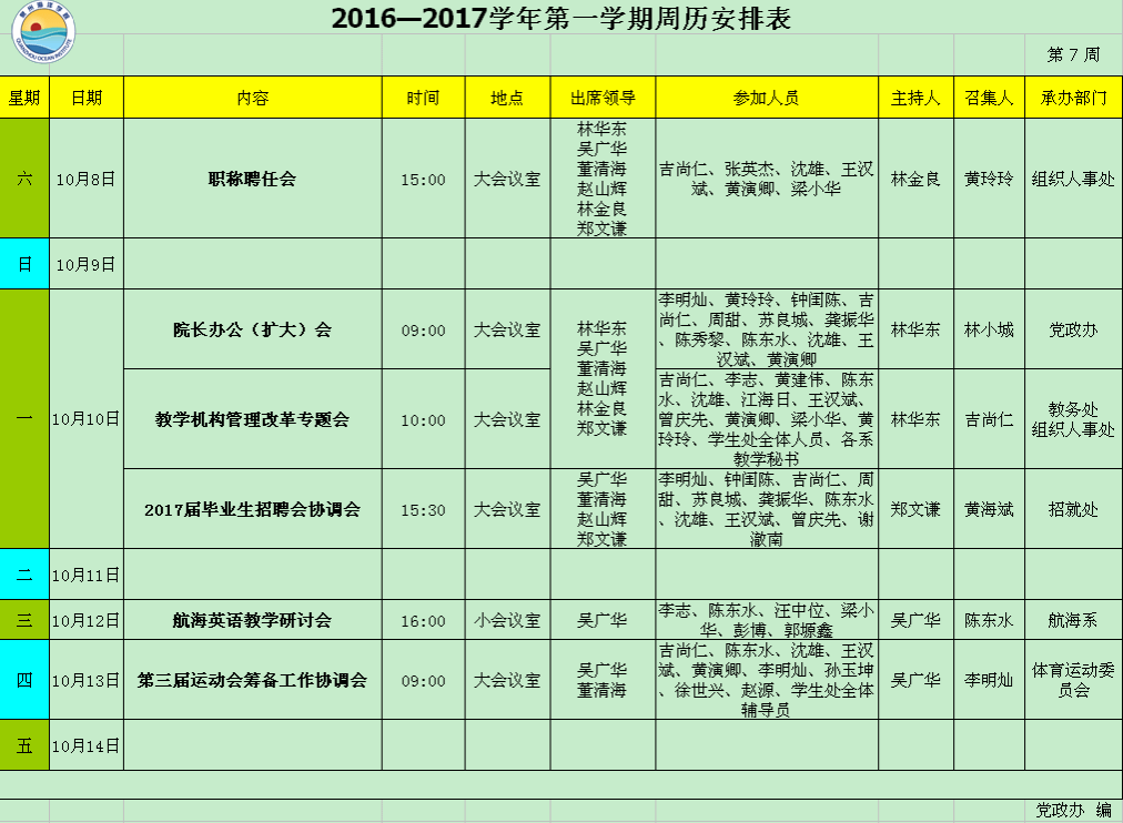 2016—2017学年第一学期第7周周历安排表