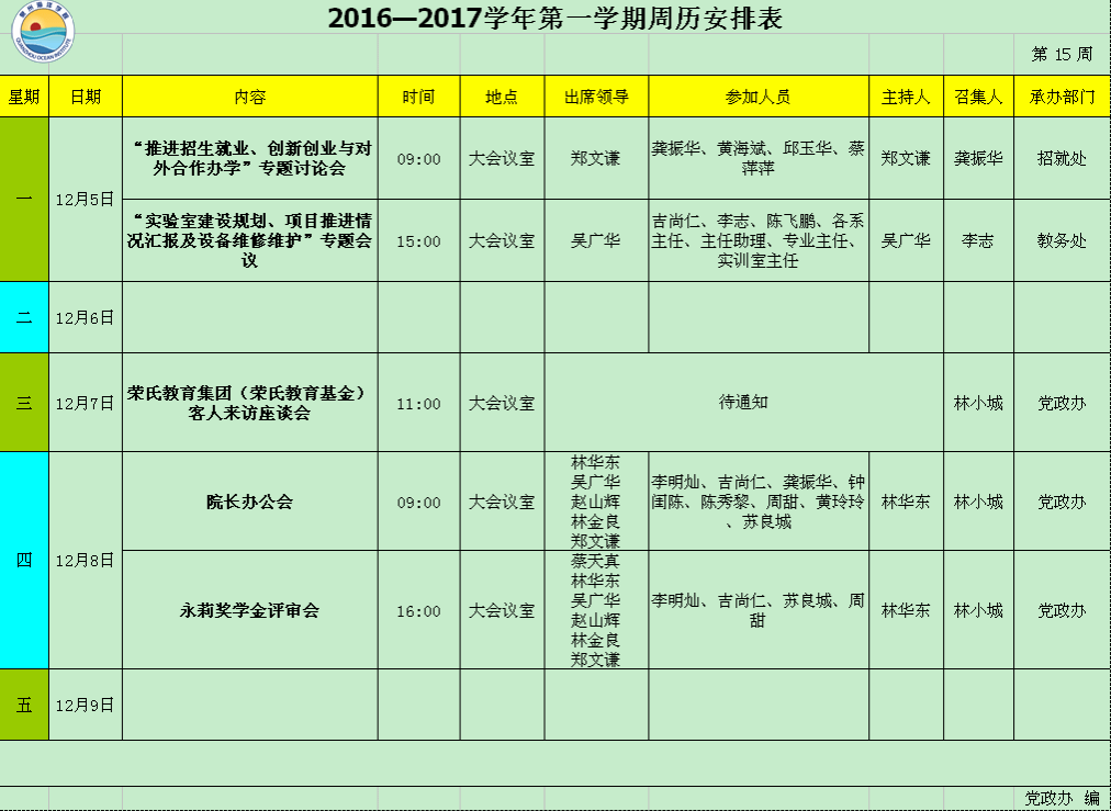 2016—2017学年第一学期第15周周历安排表