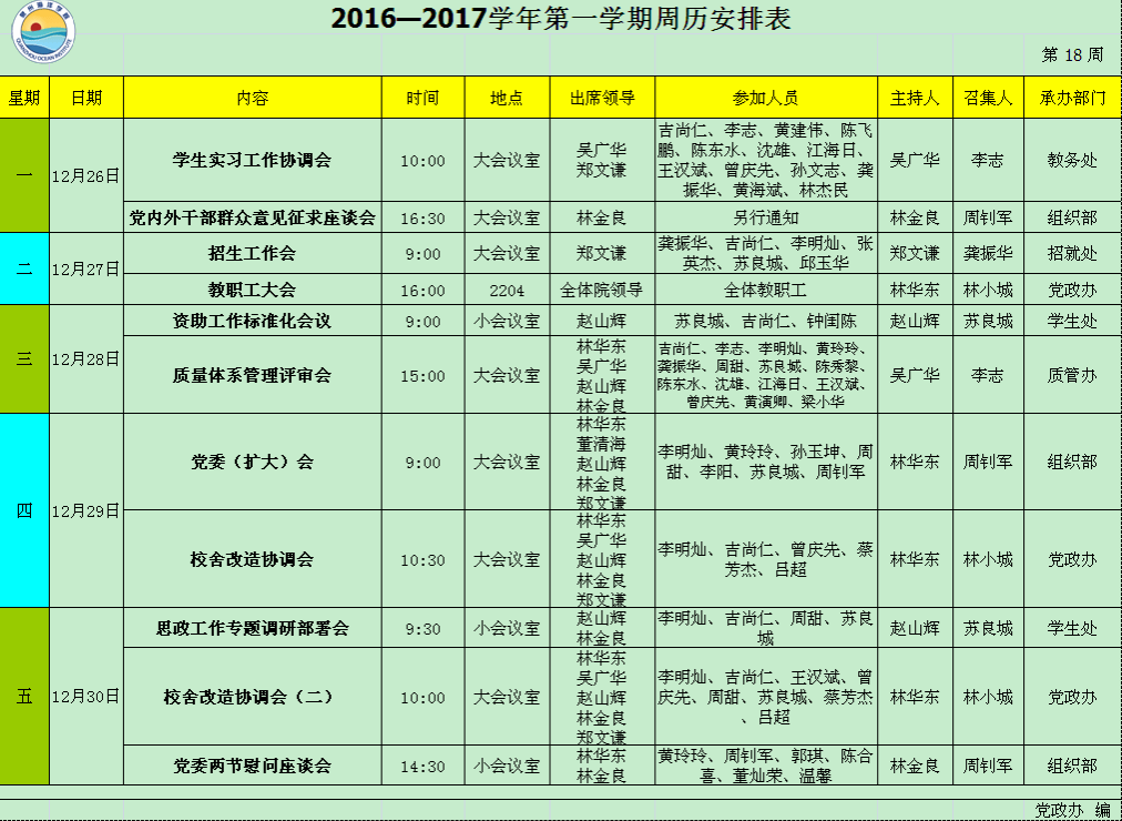 2016—2017学年第一学期第18周周历安排表