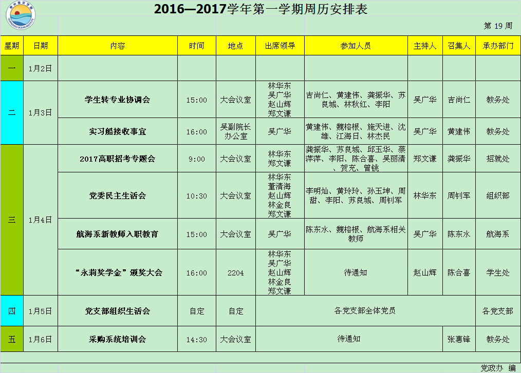 2016—2017学年第一学期第19周周历安排表