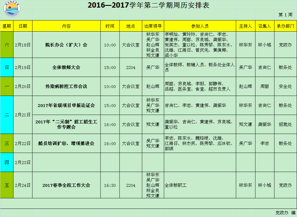 2016—2017学年第二学期第2周周历安排表
