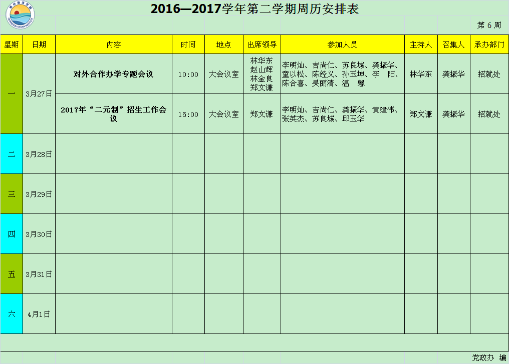 2016—2017学年第二学期第6周周历安排表