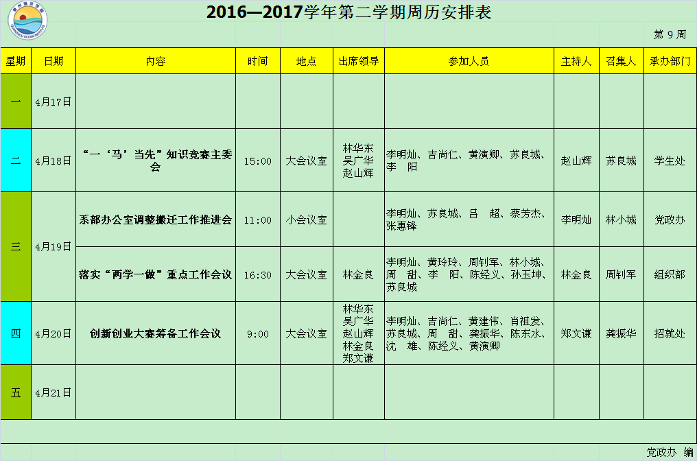 2016—2017学年第二学期第9周周历安排表