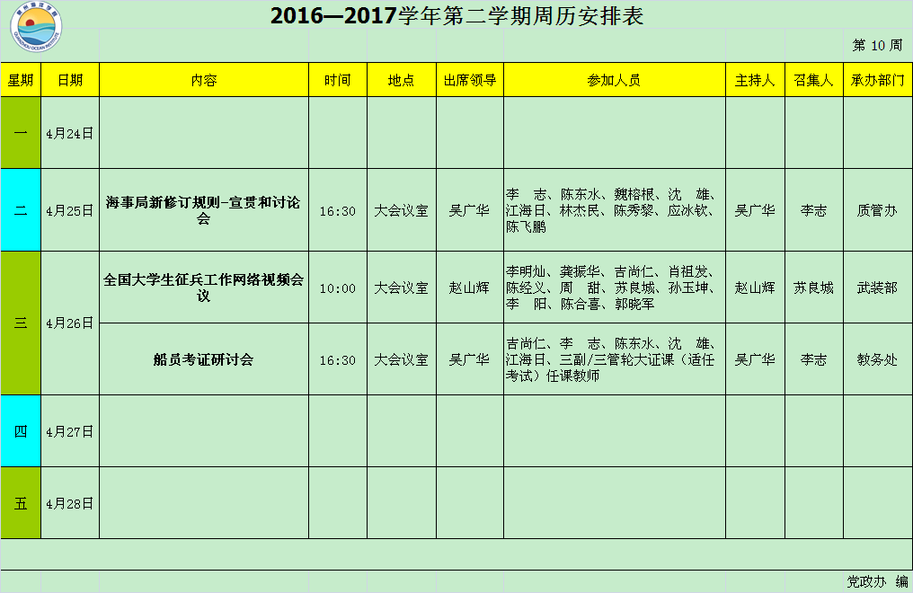 2016—2017学年第二学期第10周周历安排表