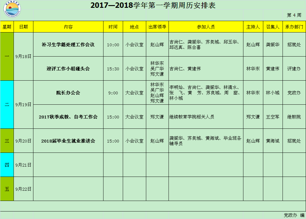 2017—2018学年第一学期第4周周历安排表