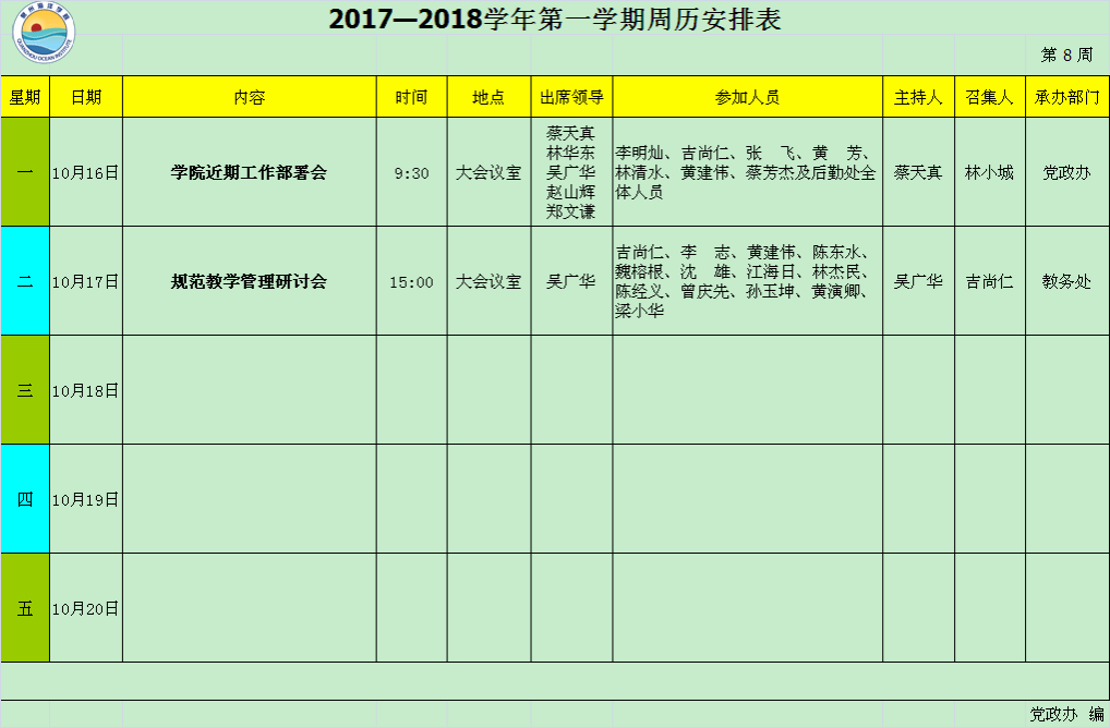 2017—2018学年第一学期第8周周历安排表