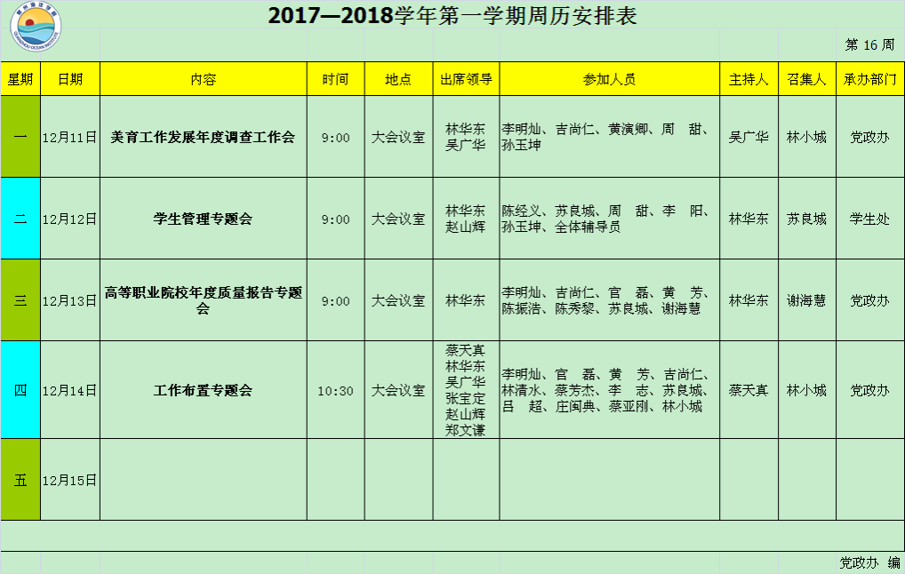 2017—2018学年第一学期第15周周历安排表