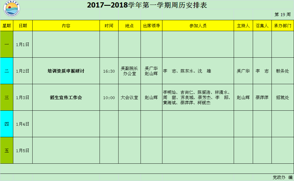 2017—2018学年第一学期第19周周历安排表