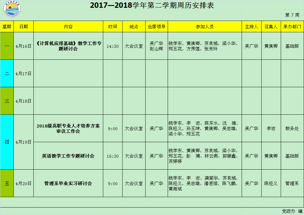 2017—2018学年第二学期第7周周历安排表