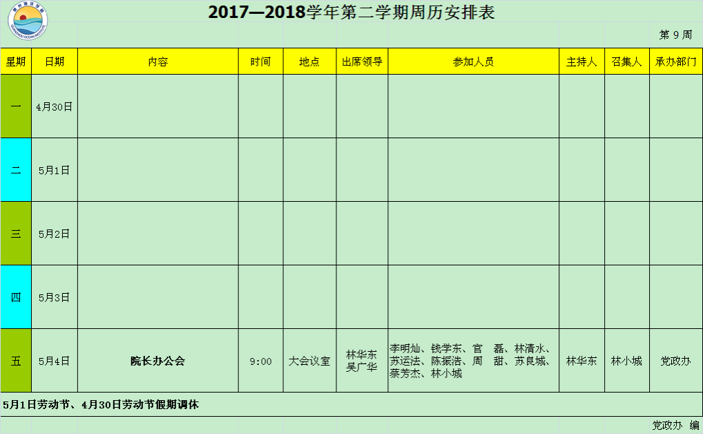 2017—2018学年第二学期第9周周历安排表
