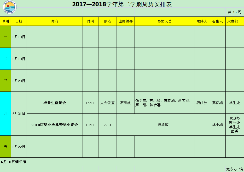 2017—2018学年第二学期第16周周历安排表