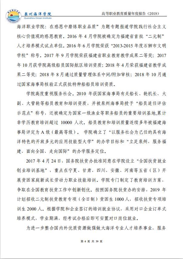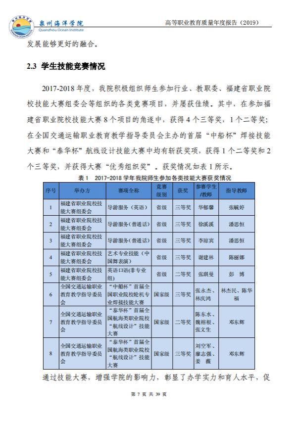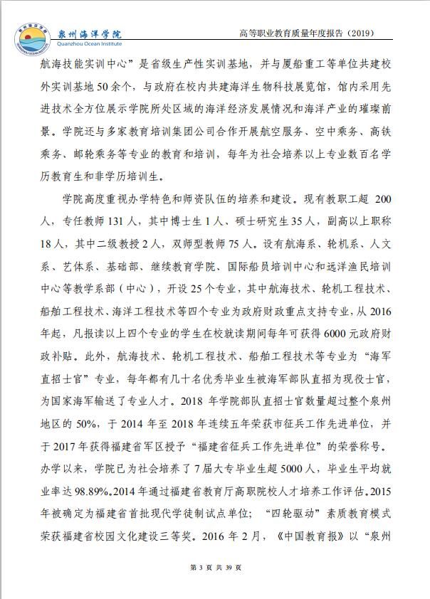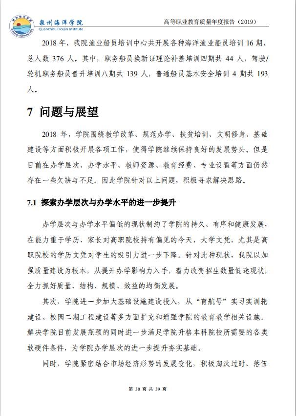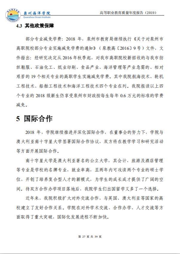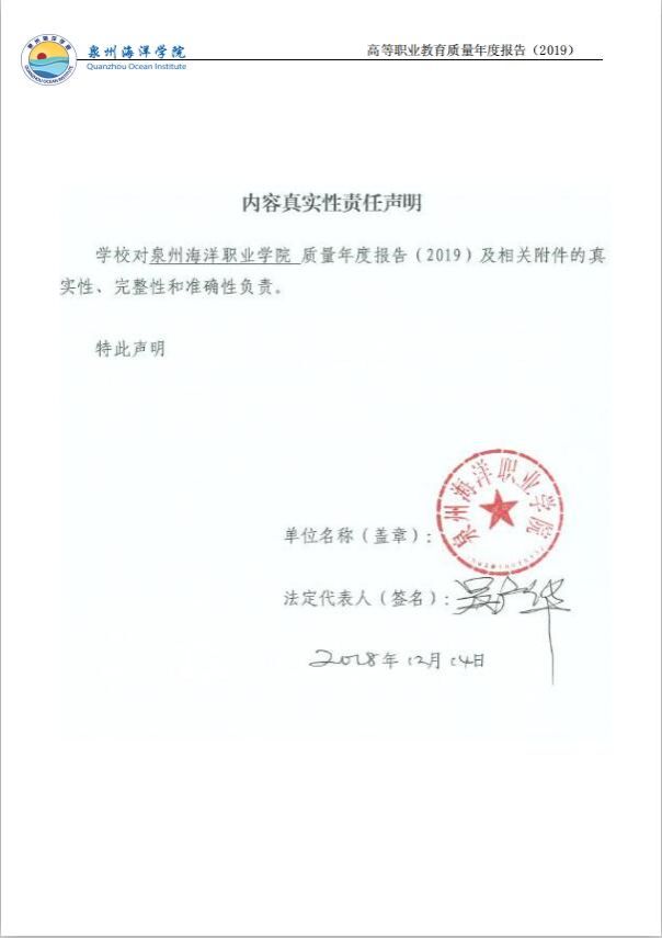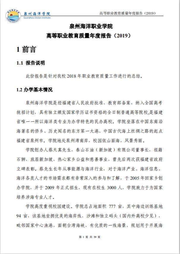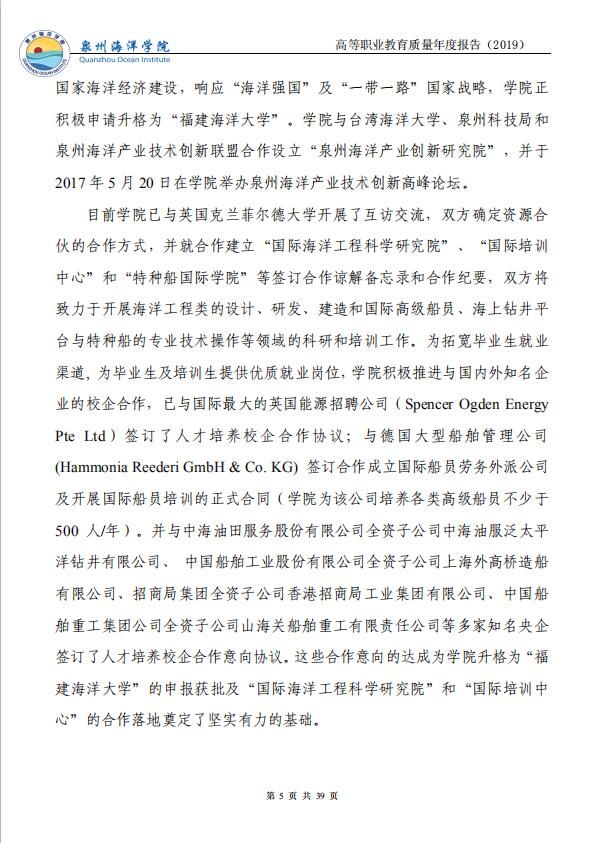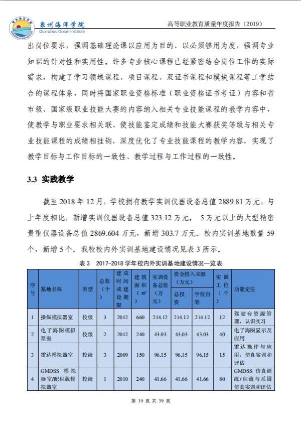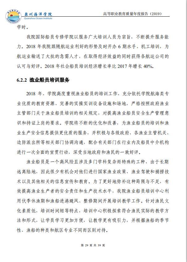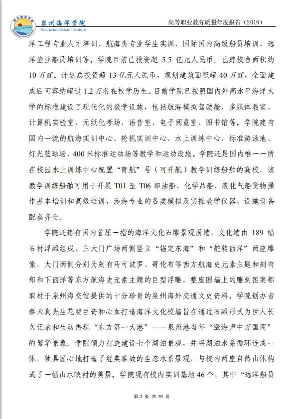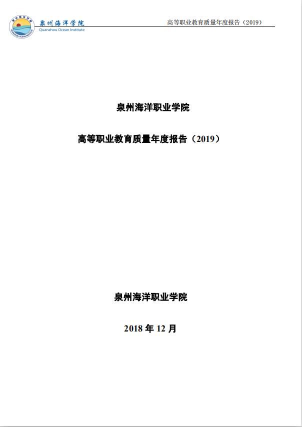 泉州海洋职业学院高等职业教育质量年度报告(2019)