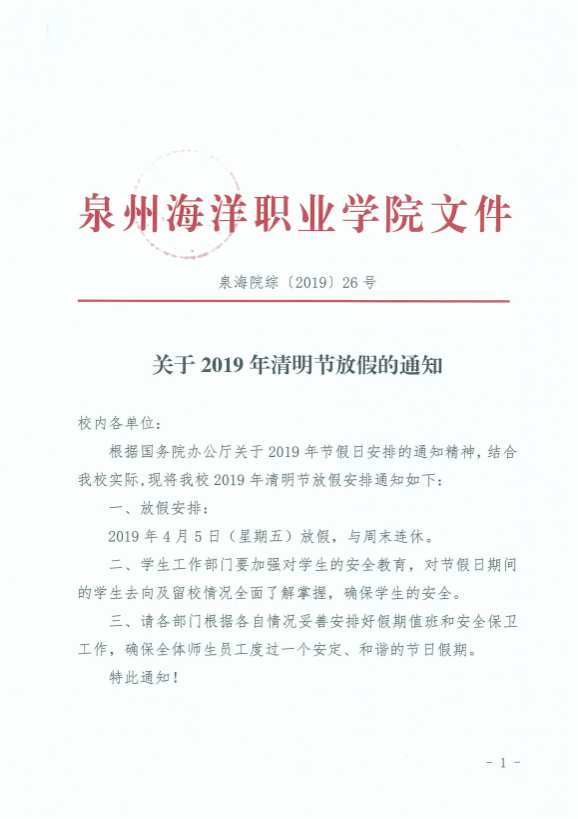 泉海院综〔2019〕26号 关于2019年清明节放假的通知