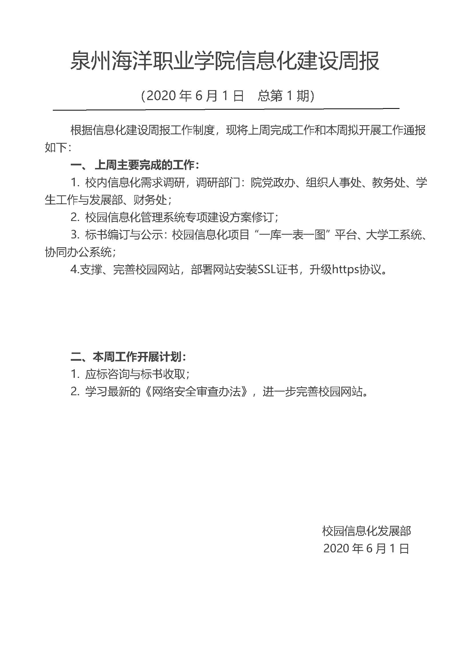 泉州海洋职业学院信息化建设周报(2020年6月1日 总第1期)