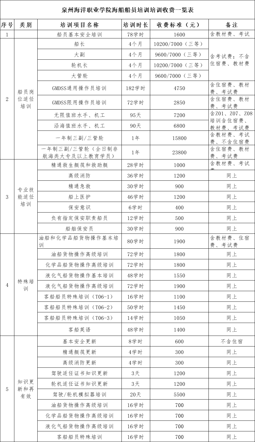 我院海船船员培训项目的收费标准自2009年以来一直严格按照《国家计委、财政部关于调整船员考试费等收费标准的通知》(计价格〔2001〕2717 号)的相关规定执行,交通运输部海事局根据国家发展和改革委员会、财政部《关于废止部分职业资格考试收费标准政策性文件有关问题的通知》(发改价格〔2016〕1350号)和《关于改革全国性职业资格考试收费标准管理方式的通知》(发改价格〔2015〕1217号)精神,于2016年8月26日发布了《交通运输部关于发布船员考试费等收费标准的通知》(交海发〔2016〕154 号),并于2016年9月1日起对船员考试费等收费标准进行了调整。我院根据新的文件精神,结合学院实际办班成本费用和供需情况,现将收费标准公布如下: