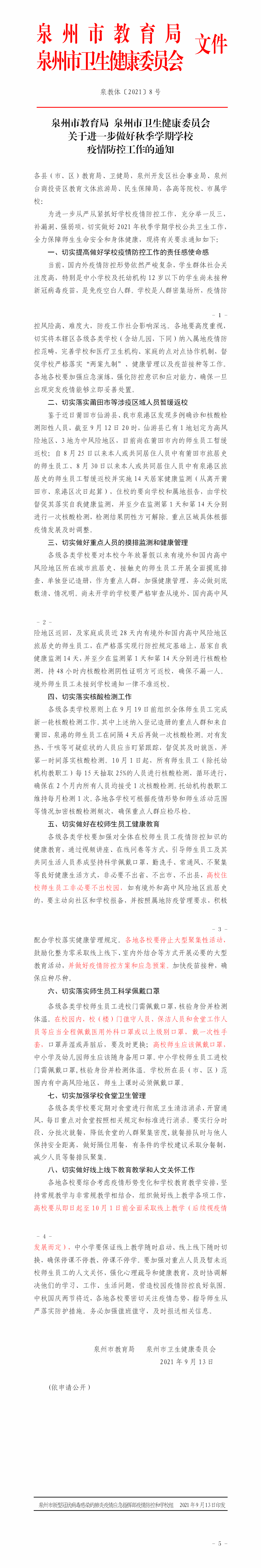 泉州市教育局 泉州市卫生健康委员会 关于进一步做好秋季学期学校 疫情防控工作的通知