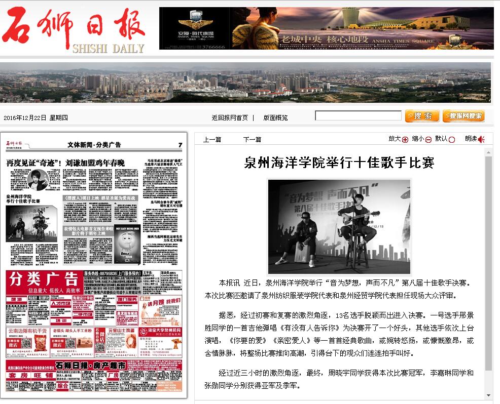 本报讯 近日,泉州海洋学院举行“音为梦想,声而不凡”第八届十佳歌手决赛。本次比赛还邀请了泉州纺织服装学院代表和泉州经贸学院代表担任现场大众评审。