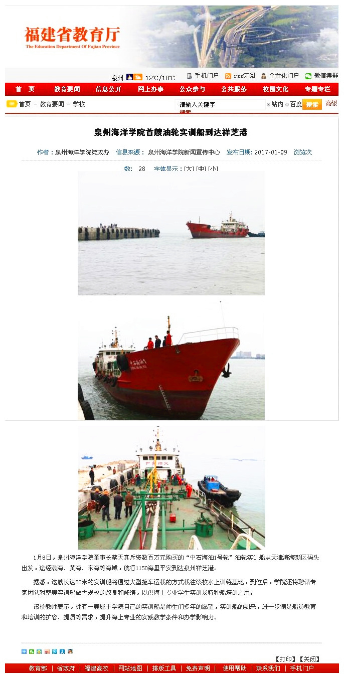 省教育厅讯 1月6日,泉州海洋学院董事长蔡天真斥资数百万元购买的“中石海油1号轮”油轮实训船从天津滨海新区码头出发,途经渤海、黄海、东海等海域,航行1150海里平安到达泉州祥芝港。