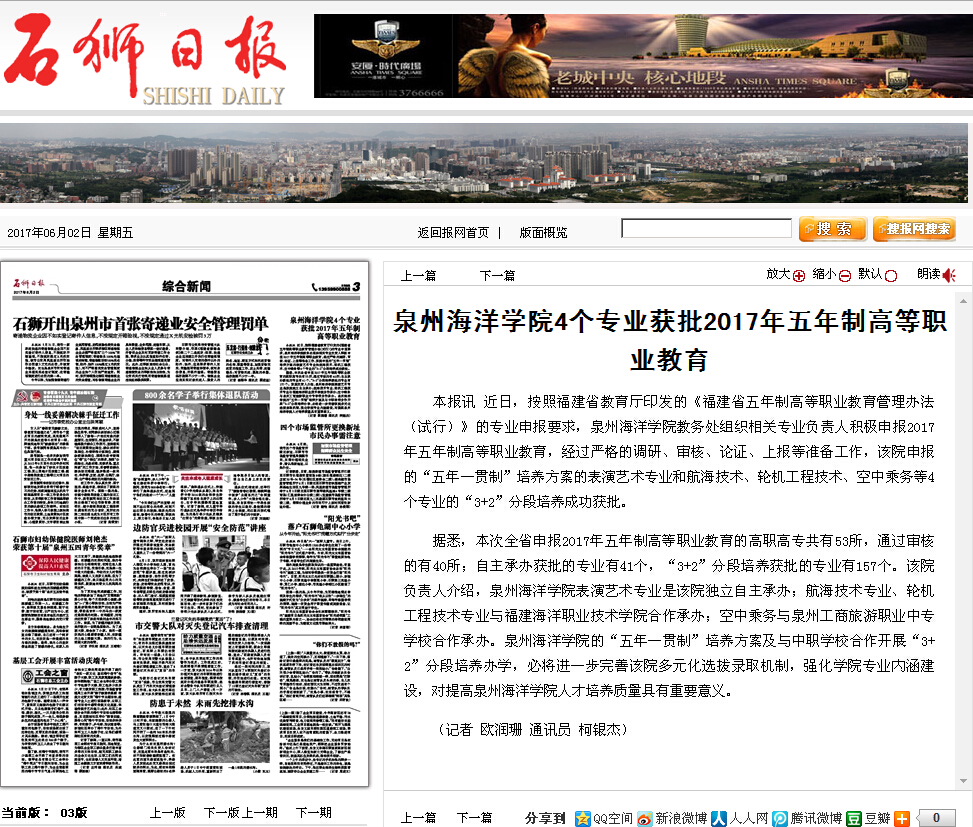 本报讯 近日,按照福建省教育厅印发的《福建省五年制高等职业教育管理办法(试行)》的专业申报要求,泉州海洋学院教务处组织相关专业负责人积极申报2017年五年制高等职业教育,经过严格的调研、审核、论证、上报等准备工作,该院申报的“五年一贯制”培养方案的表演艺术专业和航海技术、轮机工程技术、空中乘务等4个专业的“3+2”分段培养成功获批。