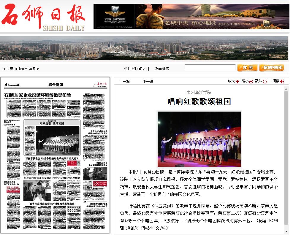 石狮日报讯 10月18日晚,泉州海洋学院举办“喜迎十九大,红歌献祖国”合唱比赛。该院十八支队伍展现自我风采,抒发全体同学爱国、爱党、爱校情怀,颂扬爱国主义精神,展现当代大学生朝气蓬勃、奋发进取的精神面貌。同时也丰富了同学们的课余生活,营造了一个积极向上的校园文化氛围。 合唱比赛在《保卫黄河》的歌声中拉开序幕,整个比赛现场高潮不断,掌声此起彼伏。最终16级艺术体育系荣获此次合唱比赛冠军;荣获第二名的班级有17级艺术体育系等三个合唱团体;17级航海1、2班等七个合唱团体获得比赛第三名。(记者 欧润珊 通讯员 柯银杰 文/图)